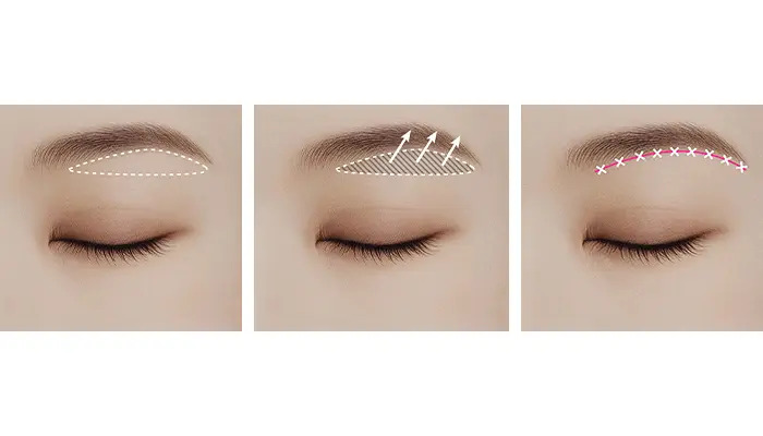 眉下切開法は、眉のすぐ下を細長く切開し、たるんだ皮膚を一部切除してリフトアップさせる施術です。必要に応じて、浅い層にある脂肪(ROOF)を取り除いたり、深い層にある眼窩脂肪も取り除くことができ、すっきりとした瞼に形成可能です。