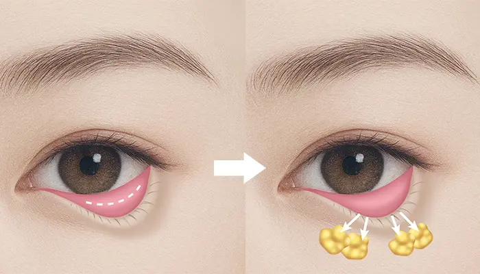 目の下のクマ取り(裏ハムラ法)は、まぶたの裏を切開してふくらみの原因となっている脂肪を凹み部分へ移動させ、目の下をフラットに整える施術です。
